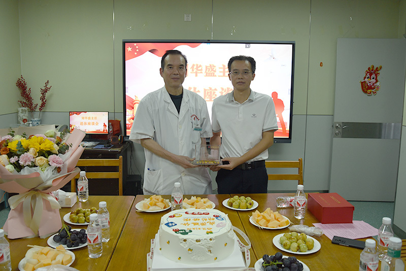 彭定基代表医院向刘华盛教授的光荣退休表示祝贺,并祝愿刘华盛教授身体健康、万事如意。他表示,举办退休座谈会不仅仅是医院对退休职工的肯定与关怀,更是一种传承、一种激励。他向刘华盛教授在医院岗位上数十年如一日的辛勤耕耘表达了衷心的感谢,感谢他为科室及医院的高质量发展作出了应有的贡献,是大家学习的榜样,希望刘华盛教授退休不褪色,日后能继续为医院发展建言献策,助力医院更好更快发展。