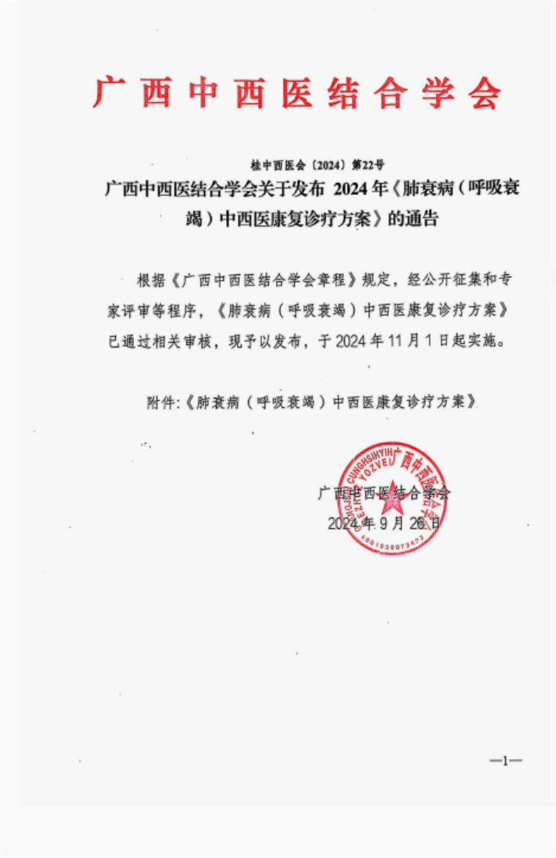 经公开征集和专家评审等程序,9月26日《肺衰病(呼吸衰竭)中西医康复诊疗方案》通过广西中西医结合学会审核并发布。该方案可供相关临床从业者参考,以为患者提供更优选的中西医协同康复诊疗方案。