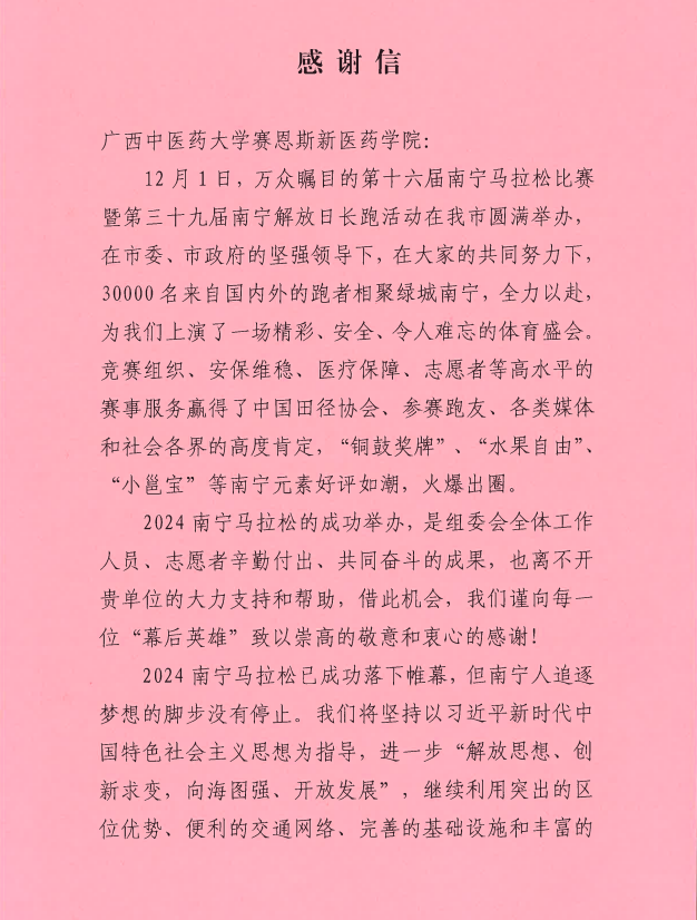 近日,赛恩斯新医药学院收到一封南宁马拉松比赛暨南宁解放日长跑活动组织委员会发来的感谢信,感谢赛院对2024南宁马拉松赛的大力支持与帮助。赛院选派的290名大学生志愿者凭借热情、专业的服务得到了广大人民群众和举办单位的表扬和感谢。