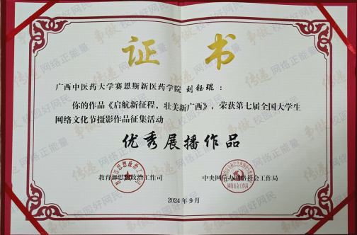 近日,教育部思想政治工作司、中央网信办网络社会工作局主办的第七届全国大学生网络文化节推选展示活动获奖名单公布,赛院2019级针灸推拿学3班刘钰琨(现留校任辅导员)创作的摄影作品《启航新征程,壮美新广西》(指导老师:何虹桦)从全国31个省(区、市)和新疆生产建设兵团所推荐的50771件作品中脱颖而出,入选第七届全国大学生网络文化节推选展示名单,荣获摄影“优秀展播作品”。此次获奖是赛院首次在该赛项中突破区赛,荣获国奖。