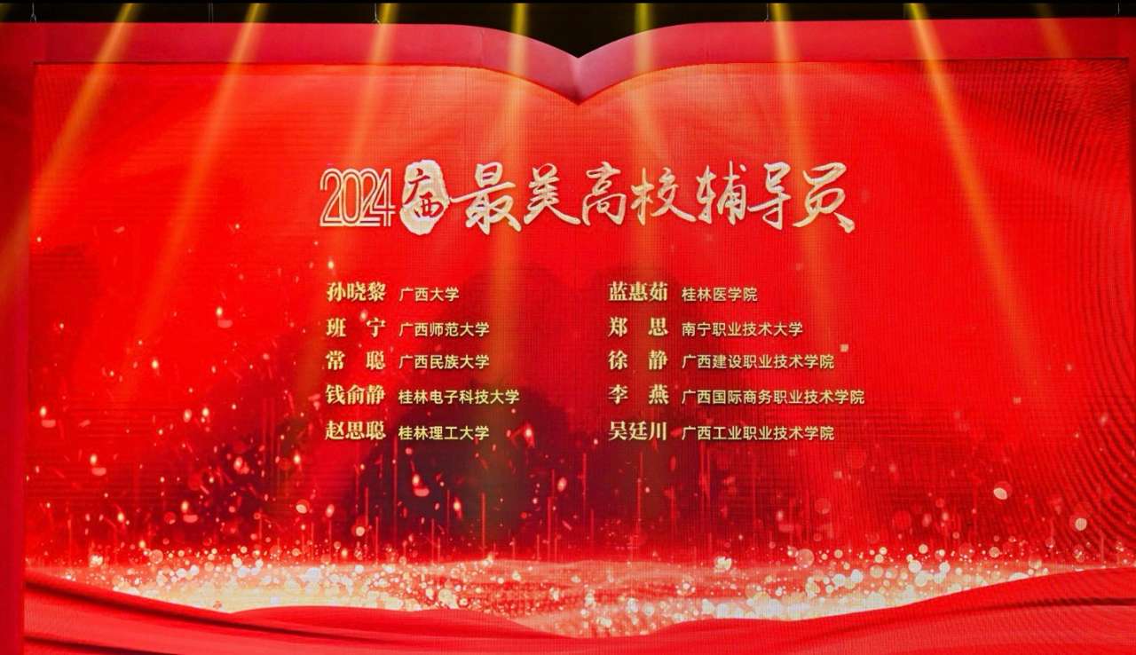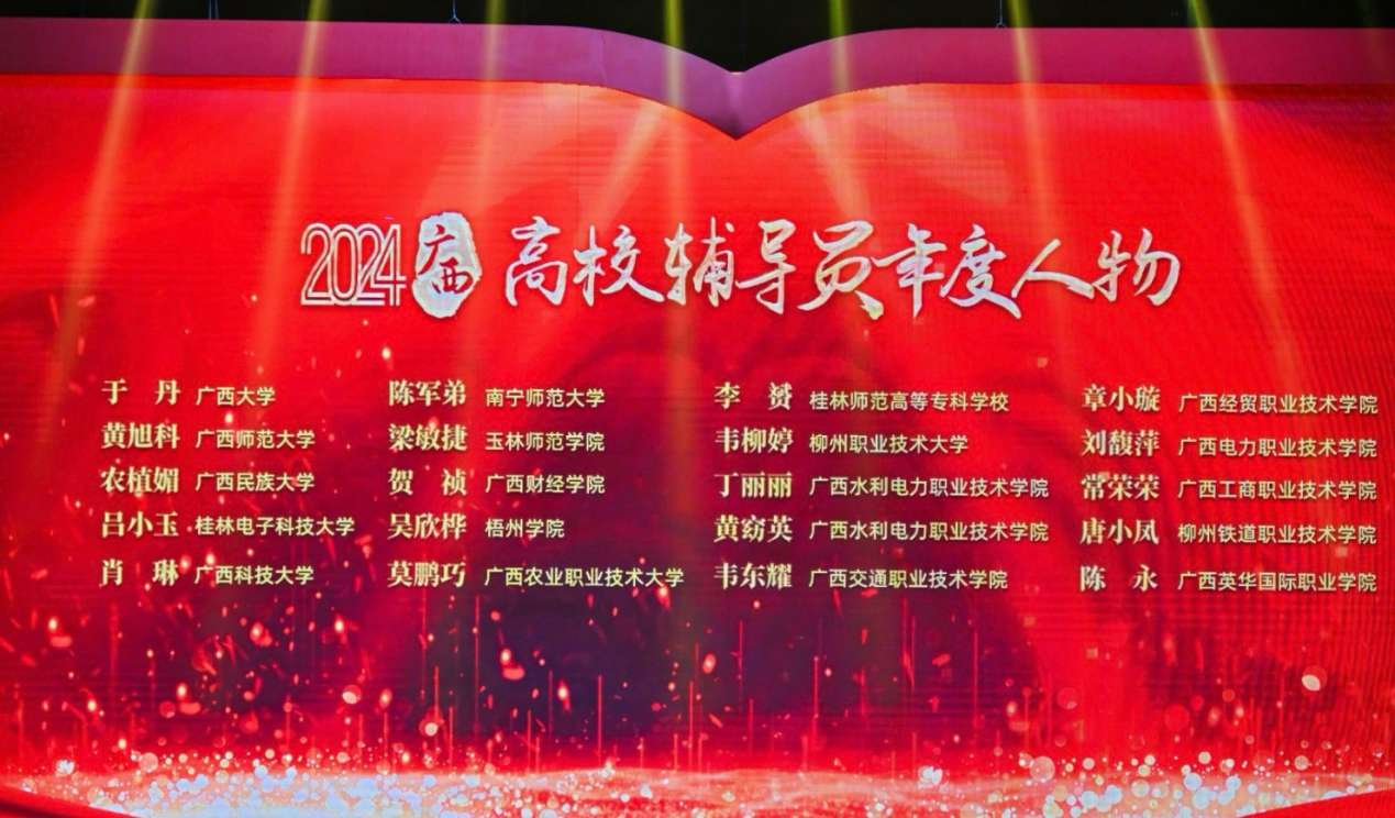活动播报了2024年广西有1名辅导员入选第十五届全国“高校辅导员年度人物”,另有3名辅导员入选第十五届全国“高校辅导员年度人物提名”。在自治区评选中,共产生了2024年广西“高校辅导员年度人物”20名、2024年广西“最美高校辅导员”10名。同时,通过视频展示、事迹展示、现场访谈等形式,生动呈现了“最美高校辅导员”们在思想政治教育、引导学生成长成才、校园文化建设等方面的突出贡献。