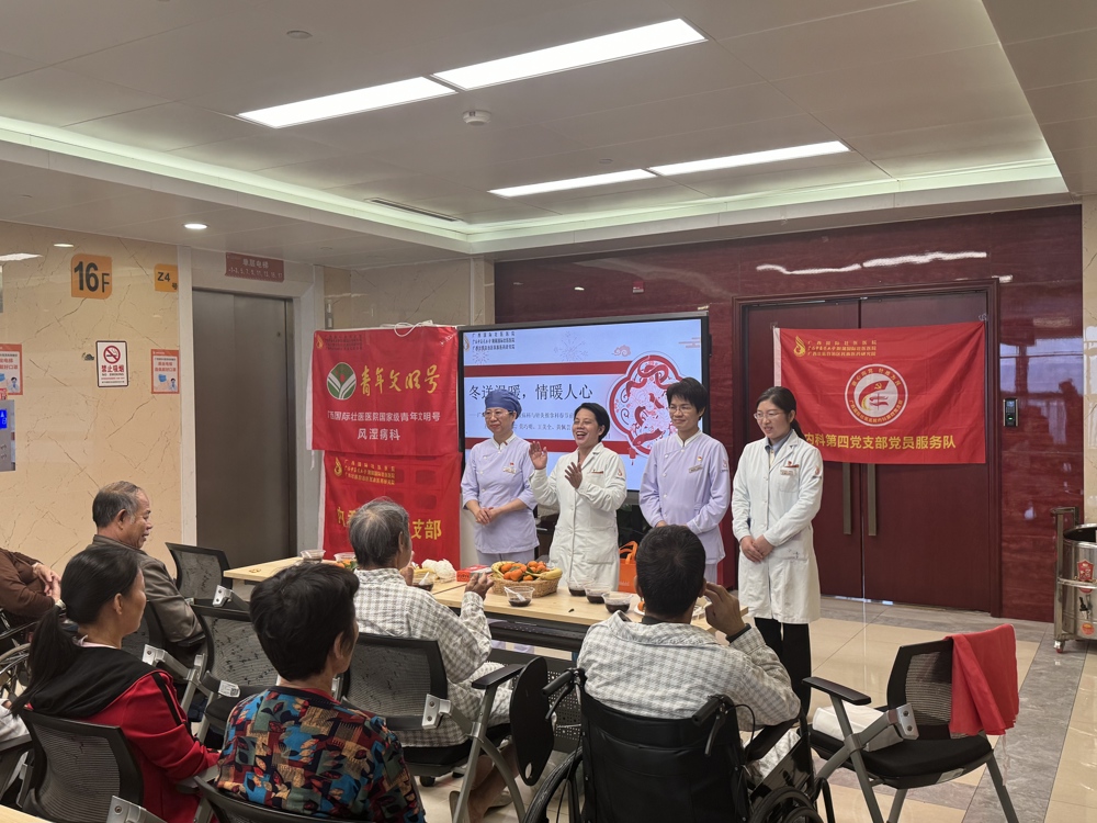 小年已至,归家有期。对于一些“久居”医院的特殊患者来说,无疑更期望春节阖家团圆,过上一个健康、祥和的节日。患者所念,亦为医护所思。1月22日,广西国际壮医医院风湿病科与壮医针灸/推拿科便携手举办了一场“冬送温暖,情暖人心”主题工休座谈会,通过健康知识讲座、患者经验交流等形式,帮助风湿骨痛、中风等患者健康过节。