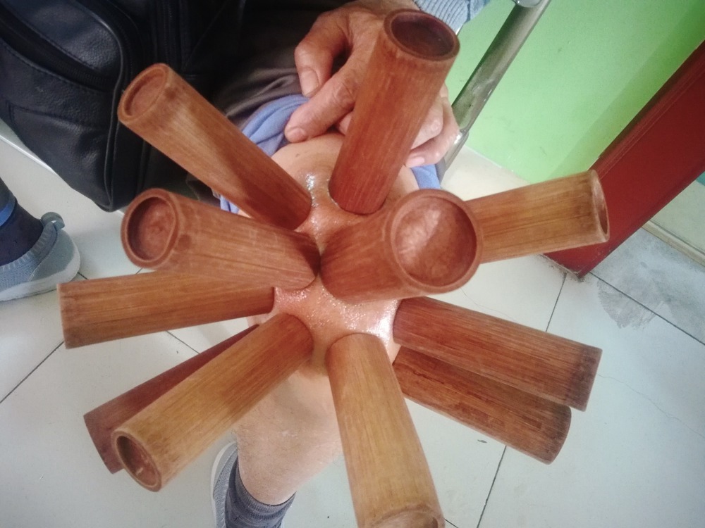 壮医药物竹罐疗法是用煮沸之壮药水加热特制的竹罐吸拔,趁热吸拔于治疗部位上的一种疗法,具有祛风除湿、活血舒筋、散寒止痛、通龙路火路气机的作用。
