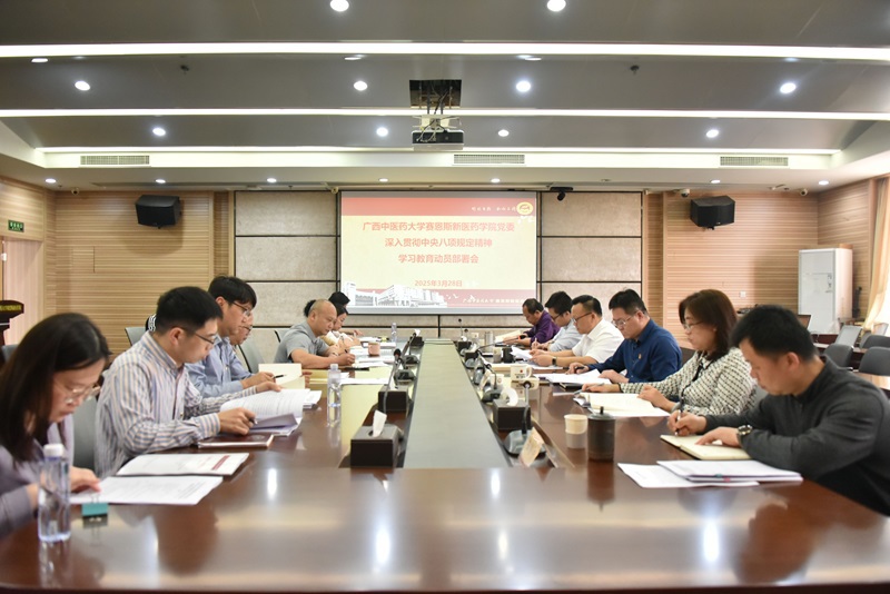 3月28日下午,赛恩斯新医药学院党委深入贯彻中央八项规定精神学习教育动员部署会在教学楼第二会议室召开。党委书记肖华业主持会议并作动员部署讲话,赛院党委副书记、院长祁文,党委副书记宋南,纪委书记张艳娟,副院长杨仕权、伍金荣出席动员部署会,相关部门负责人参加会议。