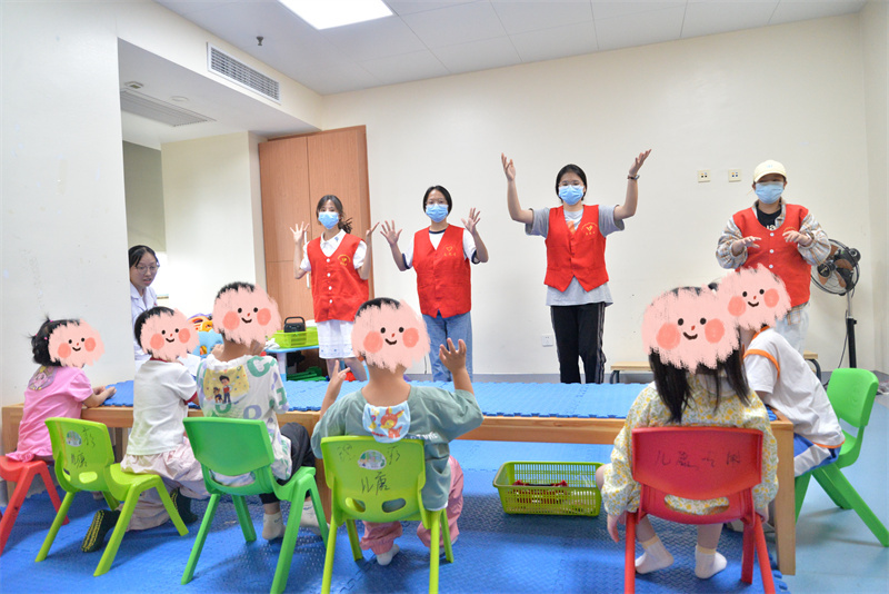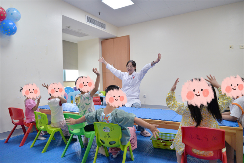 随后,医院志愿服务队带来活力四射的《健康歌》表演。志愿者们身着鲜艳服装,以轻快的旋律和整齐的舞姿点燃现场气氛。在康复师的鼓励下,孩子们也跟随节奏拍手、摇摆,病房里洋溢着欢快的氛围。