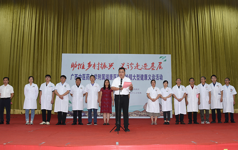 5月30日,附属瑞康医院副院长李铭带领医护团队来到都安瑶族自治县高岭镇,联合镇党委政府和中心卫生院在高岭镇文化中心广场及中心卫生院开展以“助推乡村振兴 义诊走进基层”为主题的大型健康义诊及查房教学活动。高岭镇党委书记李举国主持活动启动仪式。