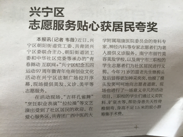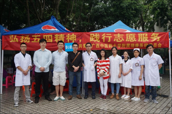 为纪念五四运动97周年和共青团建团94周年,2016年5月1日上午,我院团委联合医疗服务部在兴宁区法制广场参加兴宁区朝阳街道党工委、共青团南宁市兴宁区委主办的“青春舞动,互联网+”兴宁区纪念五四运动97周年暨青年电商创业文化活动。我院主要开展义诊、健康咨询、疾病预防知识手册发放等免费医疗服务。