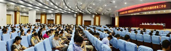 为深入贯彻党的十八大、十八届三中、四中、五中全会及全国“两会”精神,进一步加强医院党建和党风廉政建设工作,践行“两学一做”5月4日下午,一附院党委在多功能学术报告厅召开2016年党建工作暨党风廉政建设工作会议。一附院党委书记李敏智,党委副书记、院长黄贵华,党委副书记、纪委书记、副院长吴西西,副院长桂雄斌、谢胜、周建国、钟远鸣,一附院全体中层干部,各党(总)支部书记、支委,一附院全体党员共400余人参加会议。会议由吴西西副书记主持。