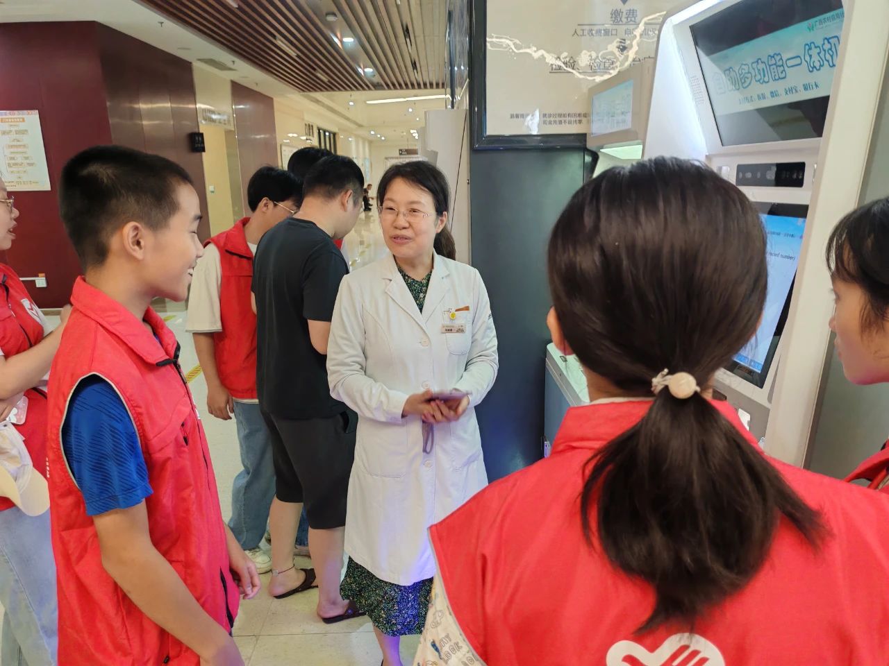 活动首日,15名“健康使者”首批志愿者齐聚一堂,参加了内容丰富的岗前培训,并正式上岗。他们分布在门诊各个岗位,化身“活地图”为患者指引就诊路线,耐心指导患者使用自助终端机打印检查报告,协助维护就医秩序。他们稚嫩却认真的身影成为门诊一道温馨的风景,也为医护人员减轻了部分工作负担。