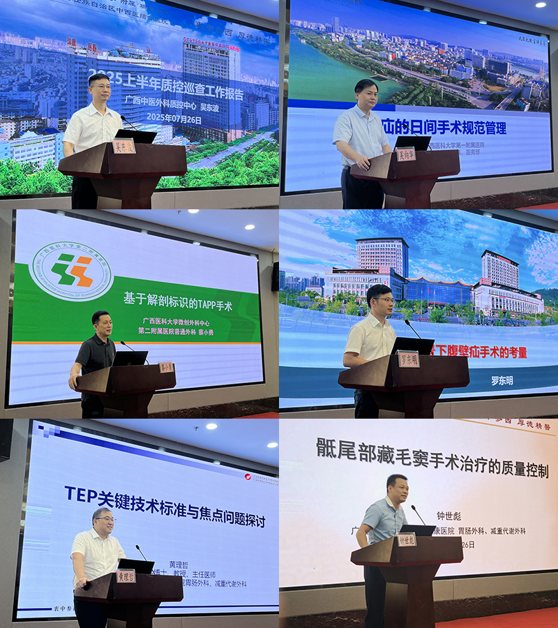 会上,吴东波作2025年上半年质控中心质控检查反馈并提出下半年工作计划。广西医科大学第一附属医院吴向华教授、广西医科大学第二附属医院蔡小勇教授、柳州市中医医院罗东明教授以及附属瑞康医院吴东波教授、黄理哲教授、钟世彪教授先后带来学术分享。