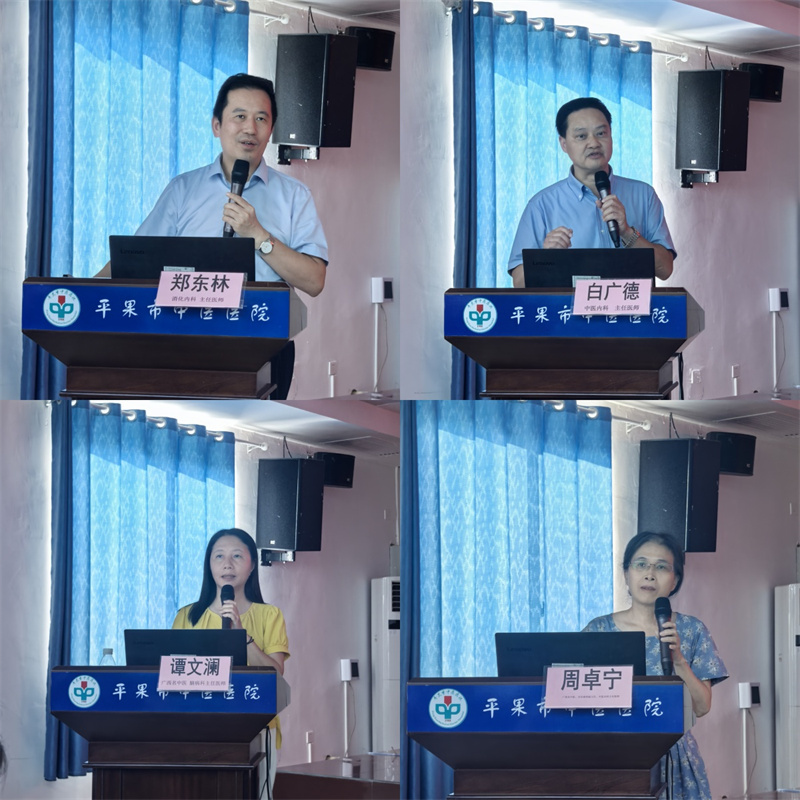 8月8日下午,学术讲座在平果市中医医院会议室举行。郑东林以《不明原因消化道出血诊治的若干问题》为题,深入剖析了可能造成消化道出血的多种原因,并分享了极具针对性的诊治思路,为基层医生提供了清晰的诊疗方向;白广德以《肿瘤中医 “五位一体” 养生康复疗法》为题,详细讲解了肿瘤养生康复疗法的具体内容和方法,为肿瘤病人的诊治提供了一套系统、全面的中医方案,让在场医务人员对肿瘤的中医治疗与康复有了更深入的认识;谭文澜以《眩晕的诊治临床思路》为题,结合大量的临床病例,详细介绍了眩晕的诊断思路与鉴别方法,以及不同类型眩晕的诊治要点,使基层医生在面对眩晕患者时,能够更准确地判断病情并采取有效的治疗措施;周卓宁教授分享了《基于“态靶辨证”之消渴(糖尿病)中医诊疗方案》,对消渴(糖尿病)的诊断标准、中医诊疗方案以及疗效评价方法进行了详细讲解,为基层医生治疗糖尿病提供了全新的中医视角和实用的诊疗策略。