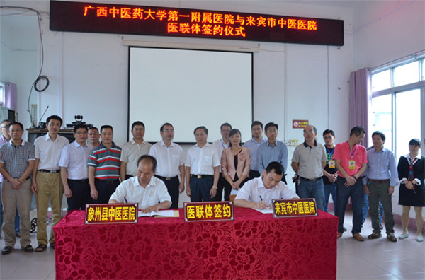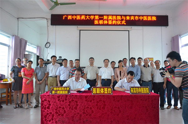 来宾市委常委、常务副市长余治平,来宾市卫计委主任黄覃梅、党委书记邓海明、副主任石美玉,一附院院长黄贵华,副院长周建国,来宾市中医医院院长梁雪峰、武宣县中医医院院长邱利忠、忻城县中医医院院长莫志华、象州县中医医院副院长韦永相、合山市中医医院副院长罗波、金秀县瑶医医院副院长徐敏玲,以及我院仙葫院区、医院办公室、医务部、护理部、财务部、门诊部、外联拓展部等部门负责人、各临床科室专家博士团,来宾市电视台、来宾日报等主流媒体记者,共同见证了这一重要时刻。签约仪式由来宾市卫计委主任黄覃梅主持。