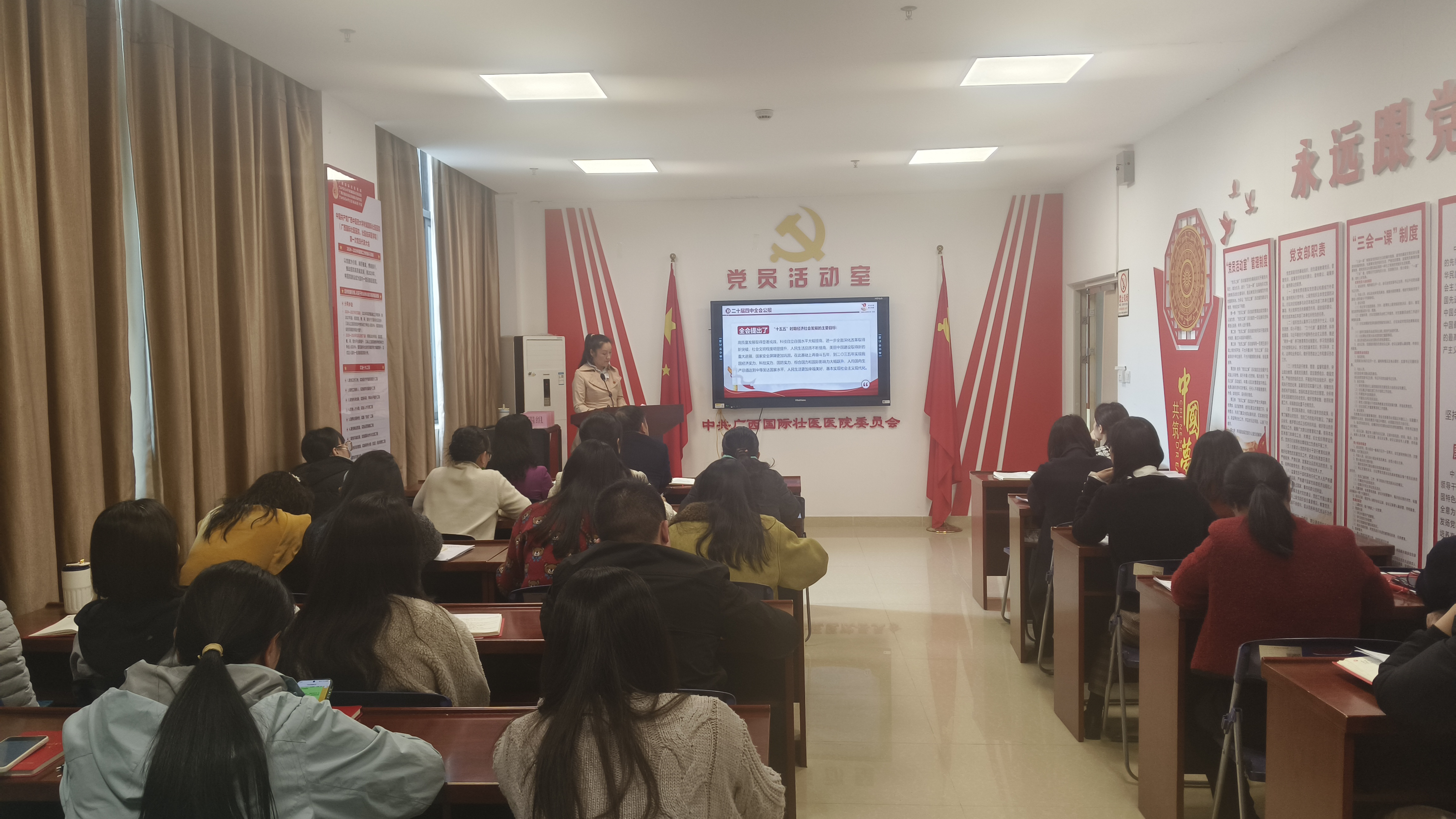 为深入学习贯彻党的二十届四中全会精神,12月25日,广西国际壮医医院机关第一党支部联合第七党支部开展专题学习暨“学全会精神·悟奋进力量”知识竞赛主题党日活动。医院党委书记秦祖杰、纪委书记陈俐以普通党员身份参加,两支部党员、预备党员、发展对象及积极分子共36人参与。