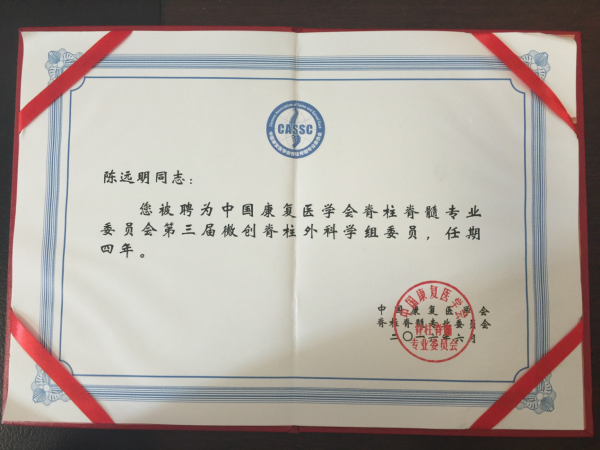 瑞康医院骨脊柱科一区主任陈远明教授获选CARM第三届微创脊柱外科学组委员