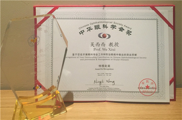 2016年9月7日-2016年9月11日,在苏州召开的“第五届全球华人眼科学术大会暨中华医学会第二十一次全国眼科学术大会”上,为表彰一附院吴西西教授在防治小儿弱视斜视及防盲治盲临床、教学、科研领域作出的突出贡献,被大会授予2016年度“中华眼科学会奖”。