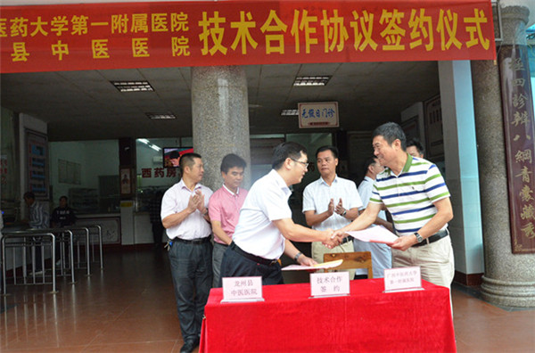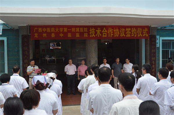 21日上午8点半,在龙州中医医院举行了简短而热烈的续签仪式。出席仪式的领导有龙州县县委常委、宣传部长、副县长何子华,我院副院长周建国,龙州县卫计局局长梁兆善,一附院院长助理、仙葫院区常务副院长黄仲海,龙州县中医医院院长吕干。梁兆善主持了仪式。吕干在致辞中谈到,近年来在一附院的帮助下,龙州县中医医院的专业技术水平得到很大提高、业务发展迅速,迫切希望能够与我院开展更深层次的合作与交流;周建国重点介绍了仙葫院区的总体情况、发展定位和远景展望,同时还表达了进一步帮扶龙州基层中医药发展的诚意,对两院未来的合作前景充满信心。何子华代表龙州县委县政府及广大群众,感谢一附院对边城龙州基层医疗发展的无私帮助;他高度肯定了两院在基层专科专病建设、人才培养工作中取得的合作成果,并希望采取互派人员任职等方式进一步加大人才培养力度;要求两院积极研究、稳步推进分级诊疗工作,同时坚持发挥中医药的特色与优势,让更广大患病群众受益。周建国和吕干续签了技术合作协议,以上领导一同为“YABO鸭脖第一附属医院技术协作医院”揭牌,一附院专家团队和龙州县中医院全体职工共同见证。