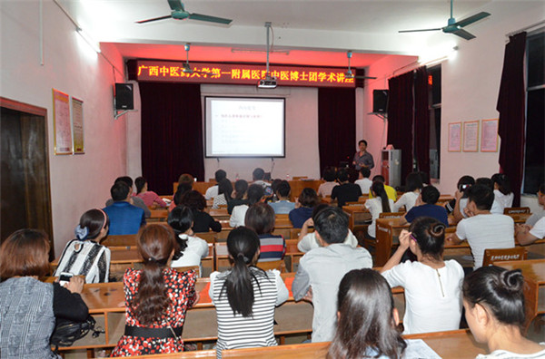 20日晚,一附院专家举行了三场学术讲座,龙州县中医医院全体医护人员和部分卫生院医师共160多人积极参加。仙葫院区骨病创伤科、股骨头坏死专科主任曾平讲座专题为《四肢骨科疾病中西医结合诊疗新进展》,脾胃肝病科主任王振常讲座专题为《丙型肝炎治疗新进展》,重症医学科主任王荣辉讲座专题为《急危重症早期识别与处理》。基层医护人员表示得到很大帮助、感受和触动很深,纷纷要求三位专家留电话,长期联系、请求指导。