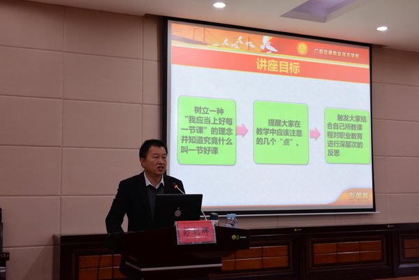 2016年12月27日下午,广西中医学校邀请了广西交通职业技术学院科研处处长彭朝晖教授到北湖校区为全校教师进行《蛰伏期教师的教学思考》为主题的讲座。本次讲座由吴彬校长主持。