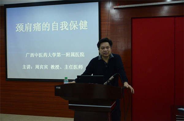 讲座在热烈和期待的气氛中进行。广西名中医、康复教研室主任周宾宾教授以“颈肩痛的自我保健”为题对窗口工作人员进行了宣教。周宾宾教授结合窗口员工需长时间坐姿工作的特点,以浅显易懂的语言从颈肩痛的定义、病因、分类、诊断、自我保健治疗等方面就窗口工作人员最常见的颈肩痛的情况,进行了全面的讲解,并通过现场视频教学,现场教授了“犀牛望月”、“风字功”、“米字功”等颈椎常用功能锻炼方法,喜得工作人员纷纷现场临摹练习。
