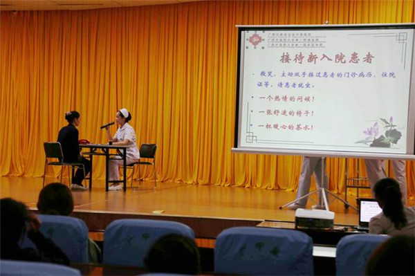培训采取情景演示的方式分两个场次进行,内容包括护理人员职业形象要求、护理人员行为规范、护理人员应遵循的行为准则等,就接诊患者、患者交接、出入院流程等环节以及输液、标本采集、发药、病情观察、相关告知等护理操作服务流程进行了情景演示。“一声问候语、一把爱心椅、一杯暖心茶”的“三一”服务让患者有了宾至如归的感觉;“仁心、慧心、诚心“的“三心”关爱贯穿于护理服务中,丰富了护理服务内涵;亲切的问候、贴心的关怀融入在护理工作的各个环节中,促进护患关系和谐。形象生动又贴近临床实际的场景再现让参加学习的人员深深地感受到,每一位护理人员的言行举止代表着一附院的形象,体现一附院的文化内涵,而护理服务的目标不仅仅是让患者满意,而是应该提升到让患者感动的境界。
