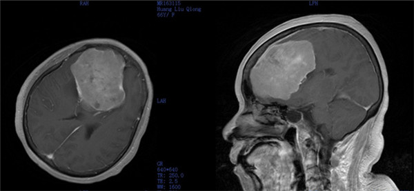 患者因“反复头晕10余年,加重并持续全身抽搐1天”由外院转入。入院诊断为:1.右侧大脑半球巨大脑肿瘤;2.继发性持续性癫痫;3.高血压病Ⅲ级,极高危组;4.Ⅱ型糖尿病;5.全身多处皮肤Ⅱ度烫伤。入院后主治医生迅速给予降颅内压、抗癫痫、控制血压、控制血糖及完善术前检查等抢救处理,但持续癫痫症状难以控制,患者病情十分危重,在使用硝普钠及多联降压药下血压还持续波动在200/100mmHg左右;胰岛素的用量已达80U/天,患者血糖水平仍固定在19mmol/L,病情明显迅速恶化,入院第三天,患者即出现嗅觉及右眼视力丧失、意识很快转入昏迷状态,四肢肌力0级,情况十分危急。