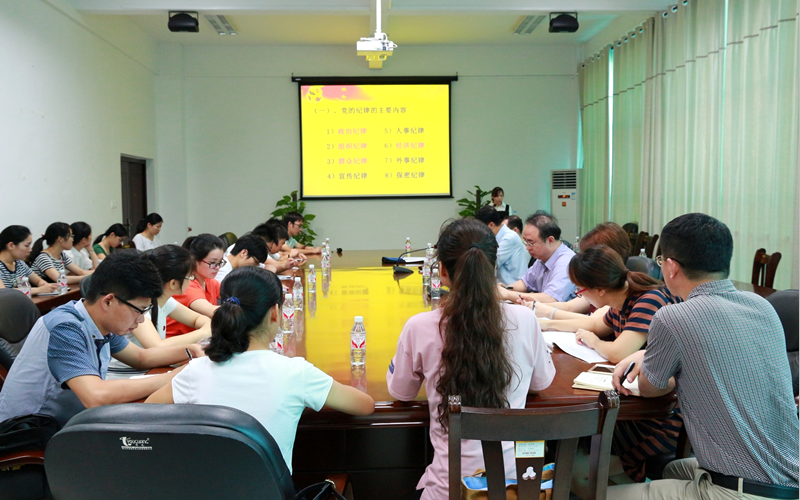 2017年6月14日上午,研究生学院2015级研究生第二党支部开展了“加强学习党的纪律 发挥党员先锋模范作用”专题学习会。学校党委书记尤剑鹏、党委组织部部长唐振宇、党委宣传部部长周江煜和研究生学院党委书记黄贵华以普通党员的身份参加了会议。会议由2015级研究生第二党支部书记樊柳园主持。