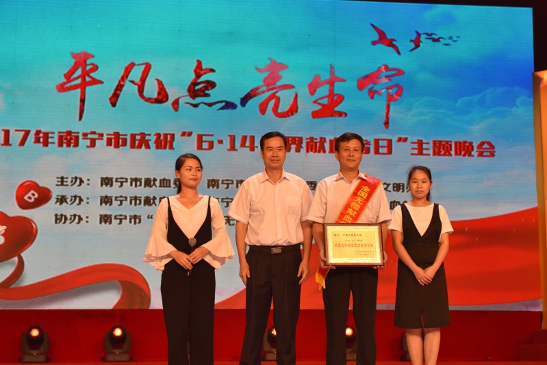 鸭脖荣获“全国无偿献血促进奖”并出席南宁市庆祝“6•14世界献血者日”主题晚会