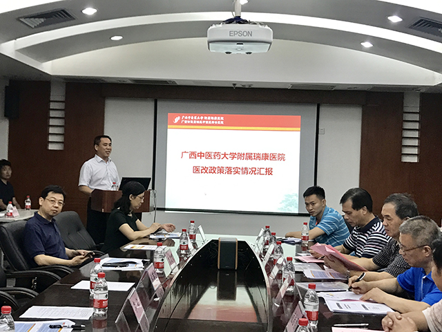 调研组最后集中在自治区人民医院听取汇报,唐友明从医院基本情况、分级诊疗制度建设情况、落实医改政策的措施以及存在的问题和建议四个方面详细介绍医院医药卫生体制改革政策落实情况。唐友明指出,瑞康医院高度重视医药卫生体制改革,成立了由院长及党委书记担任组长的医改工作领导小组,切实推进医改各项工作,医院严控药品比例、严控不合理用药、严控住院费用过快增长、大力推进中医特色建设,医改工作取得了很大成效。