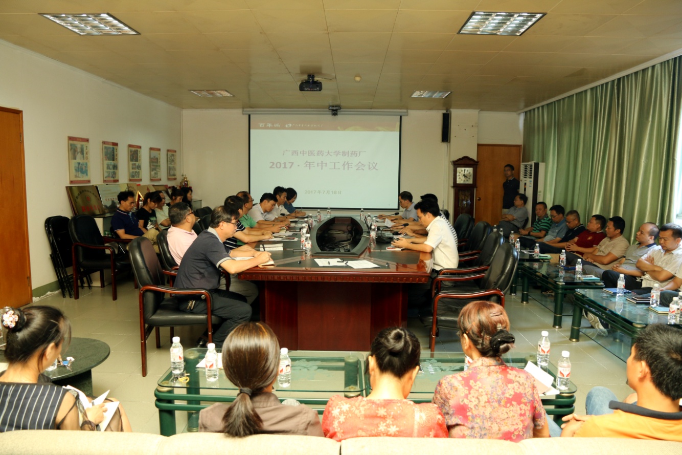 2017年7月18日下午,制药厂在科研办公楼六楼会议室召开了2017年中工作会议。学校副校长庞宇舟在校长办公室副主任蓝开宝的陪同下出席会议并作重要讲话,制药厂党委书记、厂长何天富,党委副书记、纪委书记彭定基,副厂长陈洪涛、覃明雄、吴玉强,副处级调研员张义欢以及全体中层干部、各党支部委员、工会委员、班组长以上干部职工共计70人参加了会议。会议由彭定基同志主持。