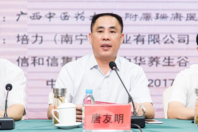唐友明介绍了瑞康医院的基本情况,强调医院现代医学技术先进、中医药特色鲜明、中西医结合优势突出的医院定位和坚持中西医并重、坚持中西医两条腿走路、平衡协调快速发展的办院方向。唐友明指出,药膳食疗是祖国医学的瑰宝,具有很好的养生疗疾作用,是中医药学的重要组成部分,近年来,全国范围内的药膳食疗服务方兴未艾,广西药膳食疗专业委员会的成立为推动我区药膳食疗的发展和规范应用搭建了一个高水平的研究、学习、交流平台,希望通过这个平台开展药膳食疗理论和产品的研究开发,经验的学习交流,加速我区药膳食疗事业的发展。唐友明希望,各级医院领导能够重视药膳食疗工作,采取切实可行的措施,建立管理和运行机制、搭建平台、壮大队伍,扩大宣传,真正开展和推动药膳食疗事业做大做强。