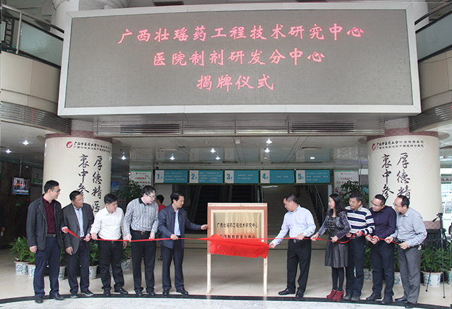 揭牌仪式上,庞宇舟、黄龙坚、唐友明、高宏君、赵立春、陈日兰、庞刚、韦思尊、黄建民、陈壮共同为 “ 广西壮瑶药工程技术研究中心医院制剂研发分中心 ” 揭牌。