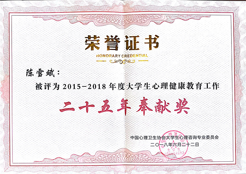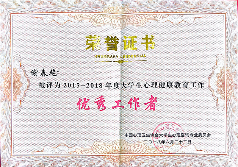 近日,第十三届全国大学生心理健康教育与咨询学术交流会在吉林大学召开,鸭脖心理健康教育与咨询中心获2015—2018年度全国大学生心理健康教育工作先进集体称号,鸭脖陈雪斌教授获全国“大学生心理健康教育工作25年奉献奖”、谢春艳副教授获全国“大学生心理健康教育工作优秀工作者”称号,这是鸭脖继2015年以来,连续获得此项荣誉。