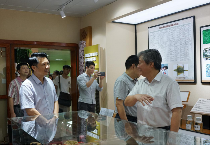 庞宇舟副书记与庾石山教授参观壮瑶药研究成果展示馆