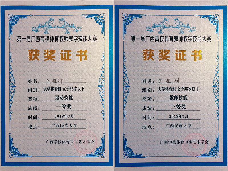 7月9日-13日,由广西学校体育卫生艺术学会主办的第一届广西高校体育教师教学技能大赛在广西民族大学举行。鸭脖体育部王惟钊老师凭借出色的运动技能和扎实的教学基本功底,分别斩获了女子35岁以下大学体育组运动技能一等奖和教师技能三等奖,彰显了鸭脖青年体育教师的风采。运动技能分为主项和副项,要求教师从十二个项目中选择主项和副项进行技能展示。这对教师的竞技能力是极大的挑战。教师技能比赛的含金量也非常高。比赛内容是比赛当日由裁判组从十二个体育项目中抽取一个技术动作,要求在两个半小时内,在没有任何教学资料辅助的情况下,完成教案设计和说课课件的制作,紧接着进行说课和无生授课。这对教师的教学基本功、信息技术运用能力和应变能力都提出了极高的要求。本次比赛为全区的体育教师提供了一个锻炼能力、展示才华的平台,也为大健康背景下,培育体育界的骨干力量起到了积极地推动作用。全区48所高校112位教师参加了比赛。