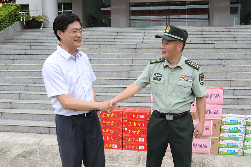 在中国人民解放军建军91周年到来之际,7月20日,学校党委副书记何并文率领校党委办公室、党委宣传部、武保部、附属瑞康医院等单位、部门代表组成的慰问团,前往鸭脖军民共建单位凭祥市某部队进行慰问。