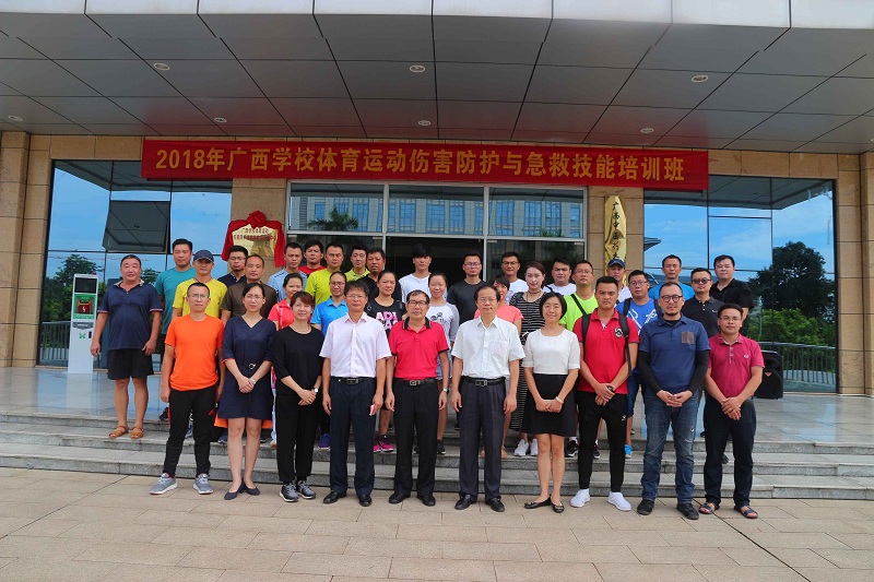 揭牌当天,“2018年广西学校体育运动伤害防护与急救技能培训班”同时开班,本次培训班由有研究中心承办,培训班分为3期,有来自全区各大本科院校、高职高专院校、各市中小学代表约100名学员将参加为9天的培训。