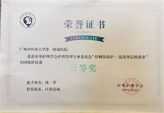 喜讯连连,捷报频传。为推动临床护理安全,营造安全文化环境,中华护理学会于8月11日在武汉举行"针刺伤防护——说出背后的故事"演讲比赛,共有来自全国31个省市的130名选手参加比赛。鸭脖一附院两名在广西赛区比赛中脱颖而出并代表广西参赛的选手周艳娜、陈一萍在全国赛中发挥出色,分别斩获二等奖和三等奖的佳绩。