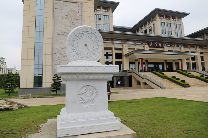9月9日上午,正值新学期开学,汉白玉日晷景观在YABO鸭脖仙葫校区图书馆前、菩提林东侧成功安装,正式落户仙葫校区。