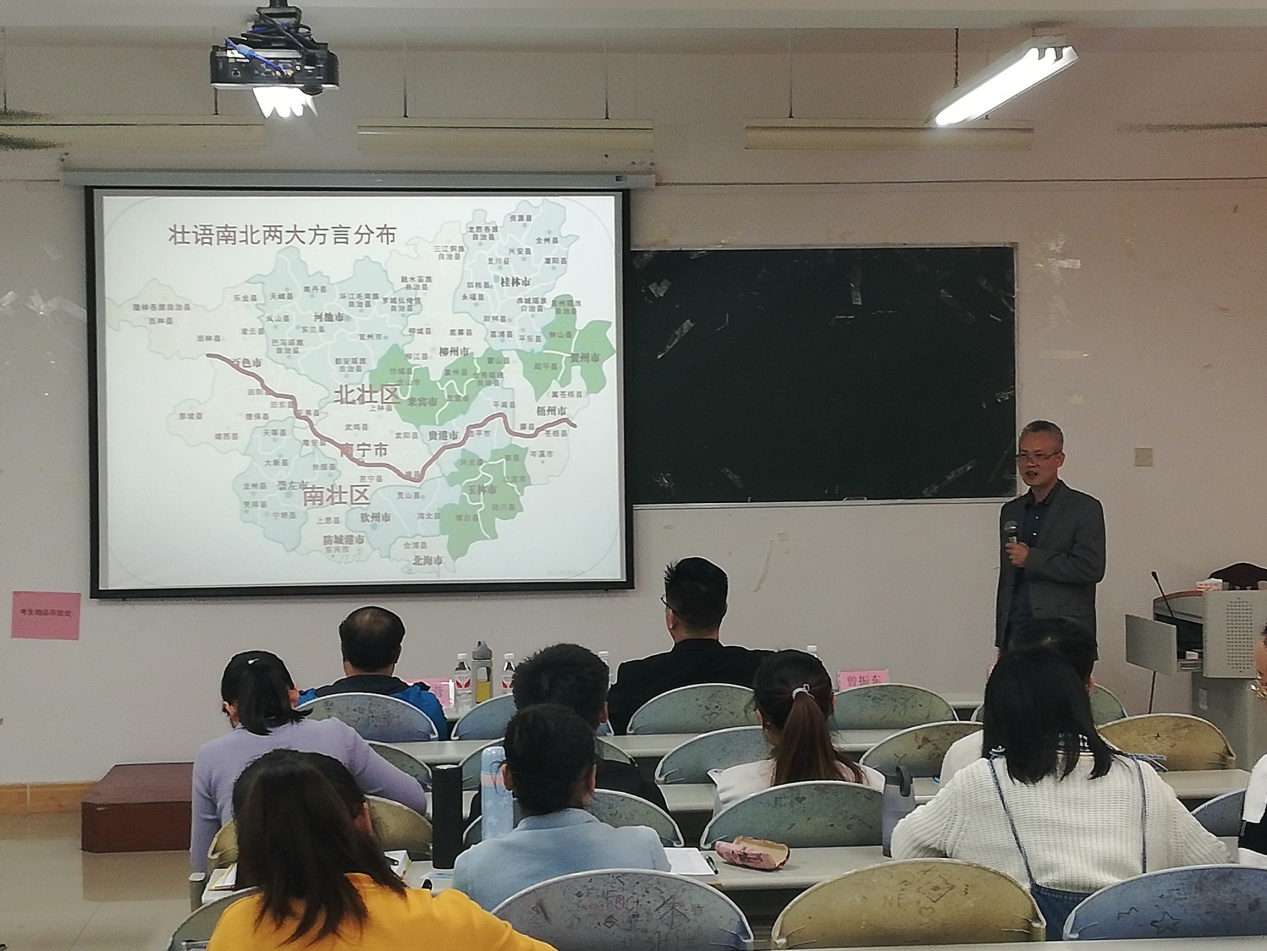 曾振东老师通过《壮语概况》来普及壮族文化知识,就古壮语起源、兴盛、衰落的过程,及新中国成立后现代壮语的制定和现状,认为壮语是壮族人民联系感情的纽带,壮医生存发展的土壤进行了详细的讲解同,让师生了解了壮语的基本概况,增强师生对壮医药文化的自信。