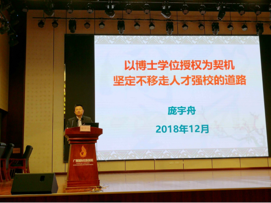 12月18日,学校党委副书记庞宇舟到附属国际壮医医院(广西国际壮医医院)作了题为《以博士学位授予为契机坚定不移走人才强校的道路》的人才工作专题讲座,附属国际壮医医院领导班子、各职能部门、临床等相关负责人聆听了讲座。医院党委书记秦祖杰主持讲座。