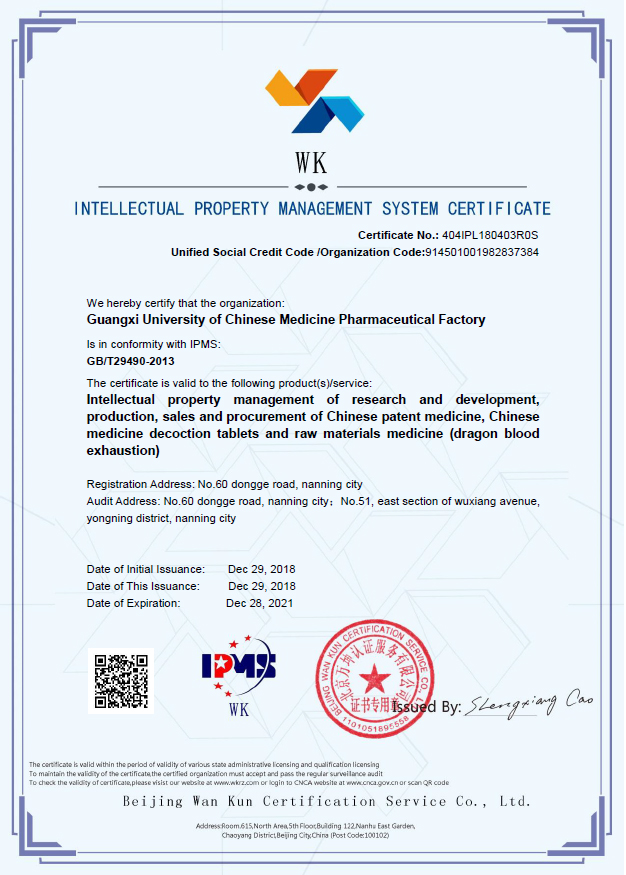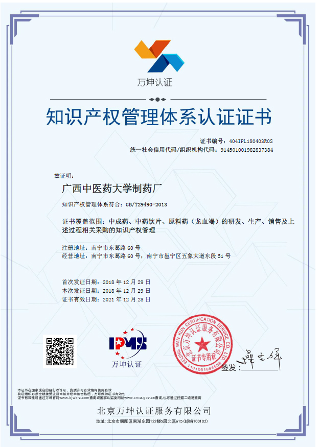 2018年12月29日,鸭脖制药厂顺利通过国家知识产权管理体系认证并获得《知识产权管理体系认证证书》,认证范围为中成药、中药饮片、原料药(龙血竭)的研发、生产、销售及上述过程相关采购的知识产权管理。由此,制药厂成为全国通过国家知识产权局《企业知识产权管理规范》认证的企业之一。
