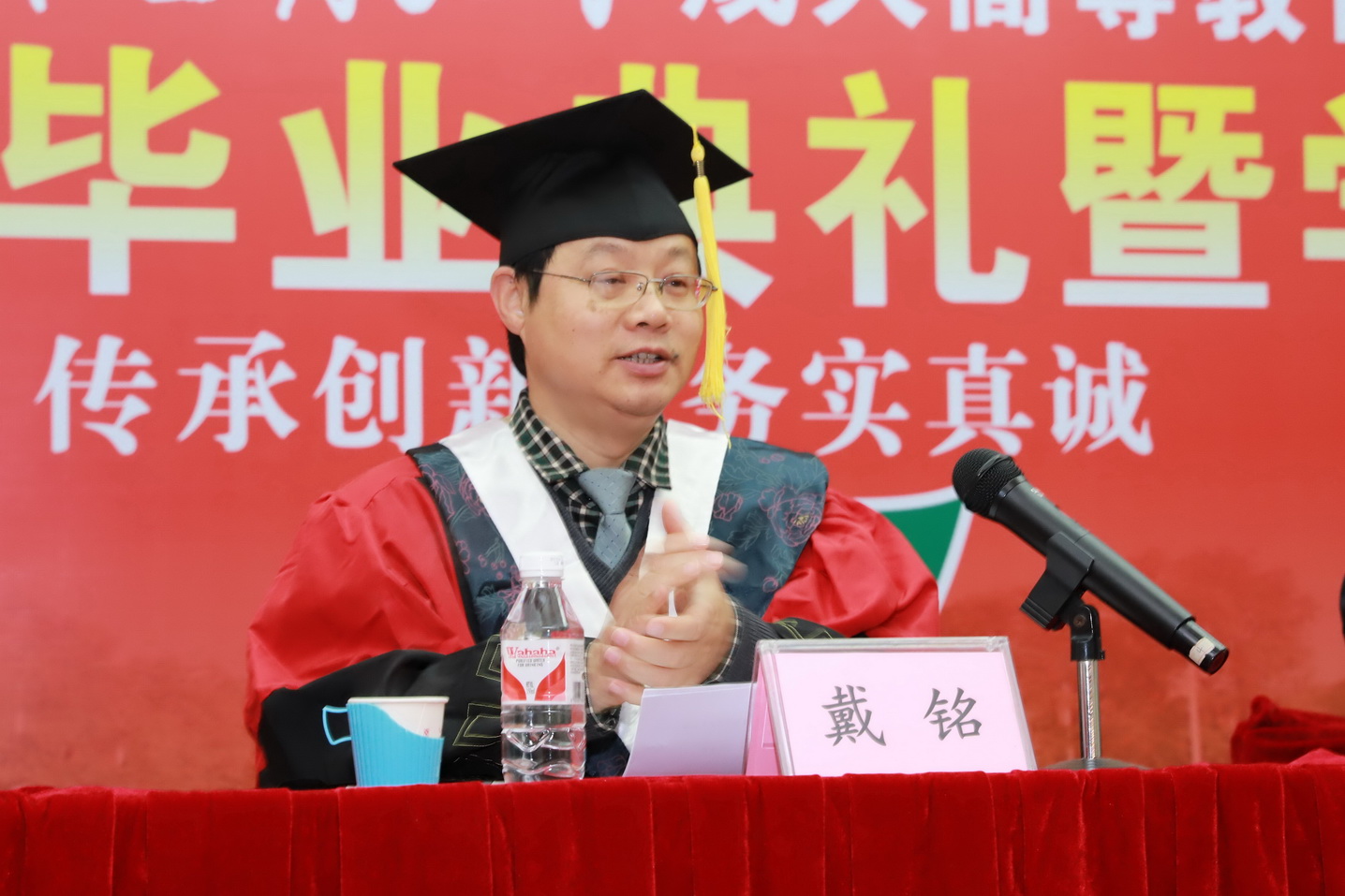 戴铭在致辞中对毕业生提出了三点希望:一是志存高远,勇挑重任。希望同学们牢记“弘毅自强,传承创新”的校训,立足社会,踏实工作,肩负起人民健康、国家复兴的责任;二是生命不息,学习不止。“天行健,君子以自强不息”,同学们要保持终身学习的习惯和思考的热情,求知若渴,虚心若愚,不断探求新知、追求真理,永葆思想的活力;三是学会感恩,宽容自信。无论今后走到哪里,希望同学们牢记自己的使命和担当,对国家、对父母、对爱人、对孩子的一份责任,不忘初心、砥砺前行。