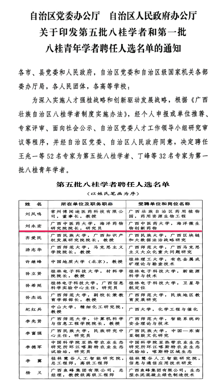 日前,自治区党委、自治区人民政府批准了第五批“八桂学者”和第一批“青年八桂学者”,来自区内各高校、企业、科研院所等52名专家入选“八桂学者”,32名专家入选“青年八桂学者”。鸭脖海洋药物研究院院长刘永宏研究员成功入选“八桂学者”。刘永宏研究员也是鸭脖第1位全职入选这一殊荣的专家。