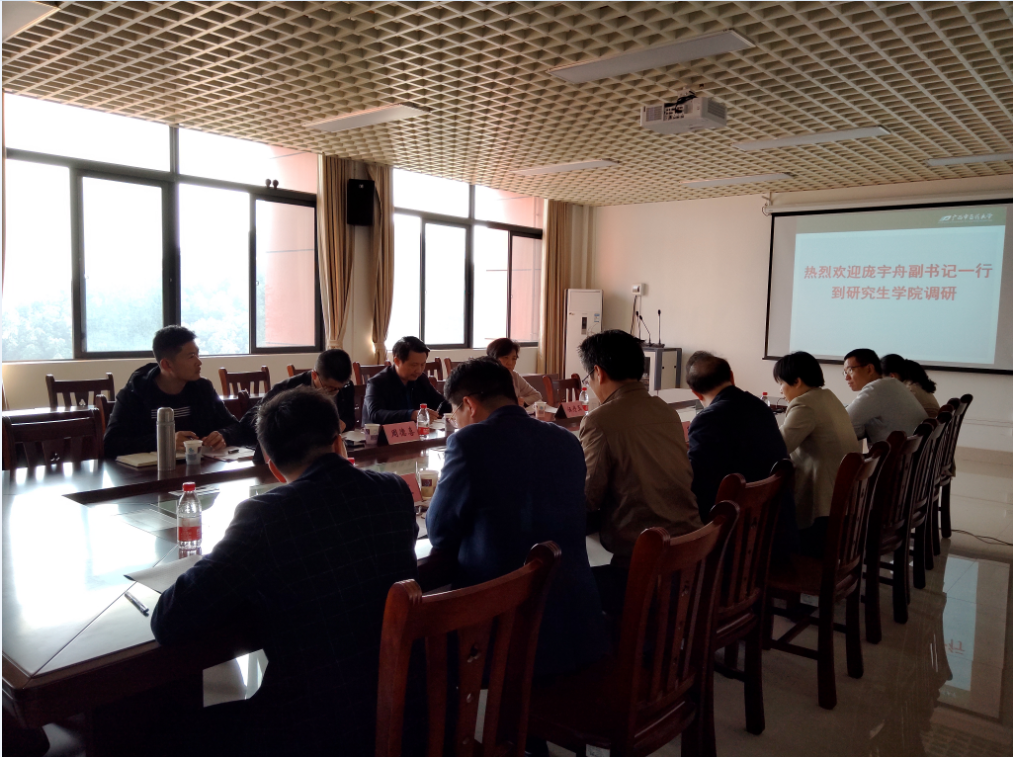 3月12日下午,校党委副书记庞宇舟到研究生学院调研,党委办公室副主任周德喜、职改办副主任伍丹玉、招就处副处长辛华陪同。研究生学院党委书记黄贵华、党委副书记李朝晖,副院长易蔚、祁文及各职能科室负责人参加座谈会。