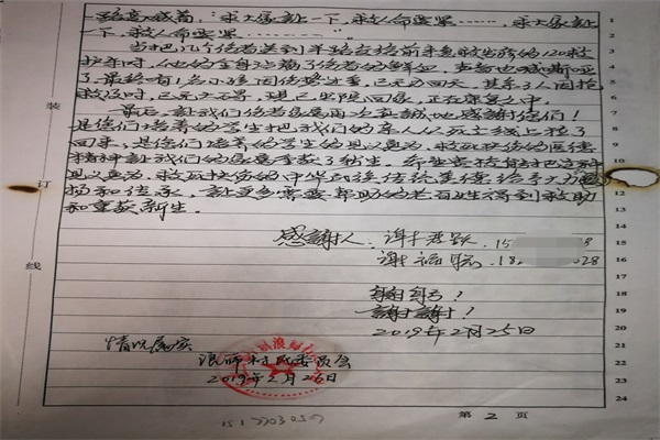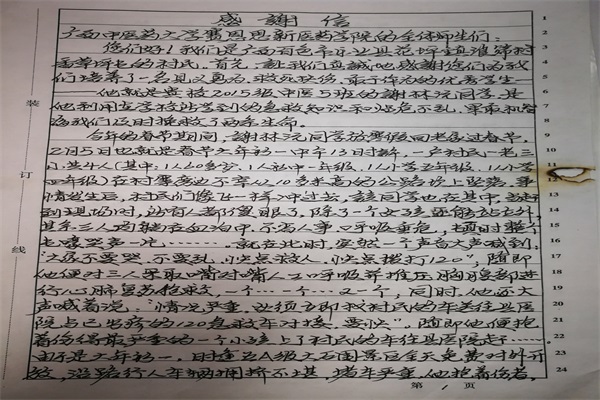 3月14日,YABO鸭脖赛恩斯新医药学院(简称“赛院”)收到一封来自广西百色市乐业县花坪镇浪筛村香坪屯一位村民的感谢信,对赛院2015级中医5班谢林沅同学救死扶伤的行为表达真挚的谢意。