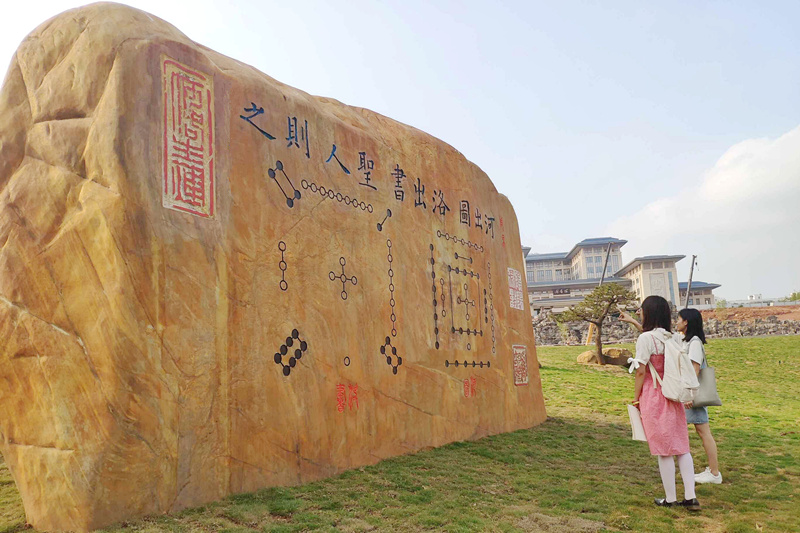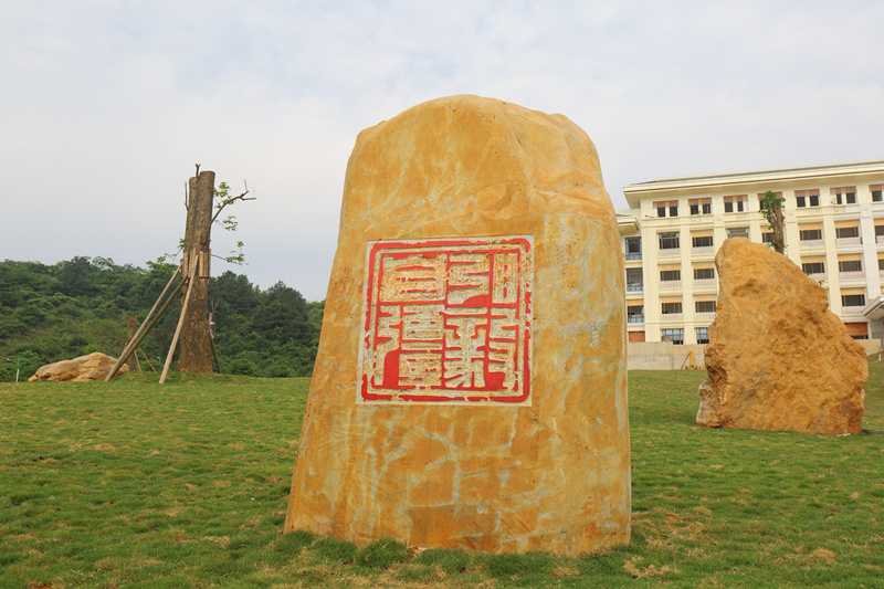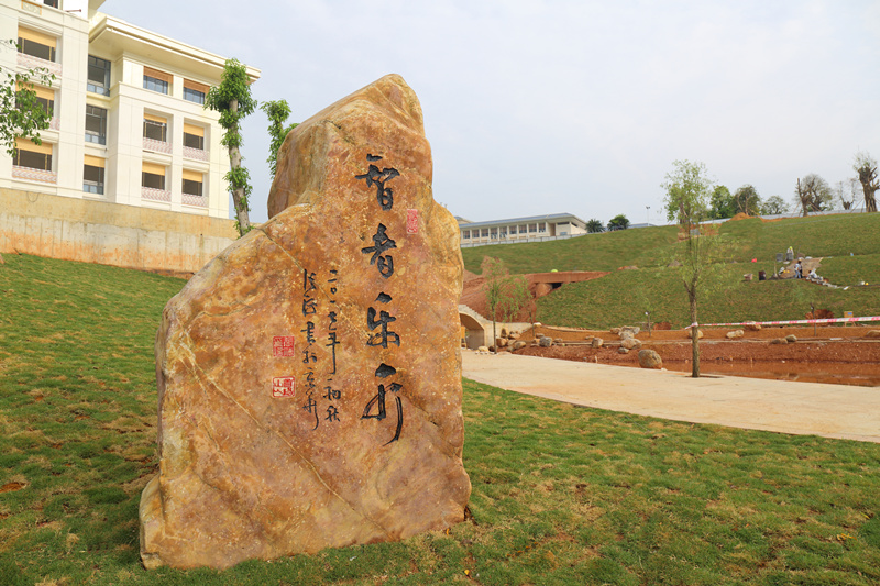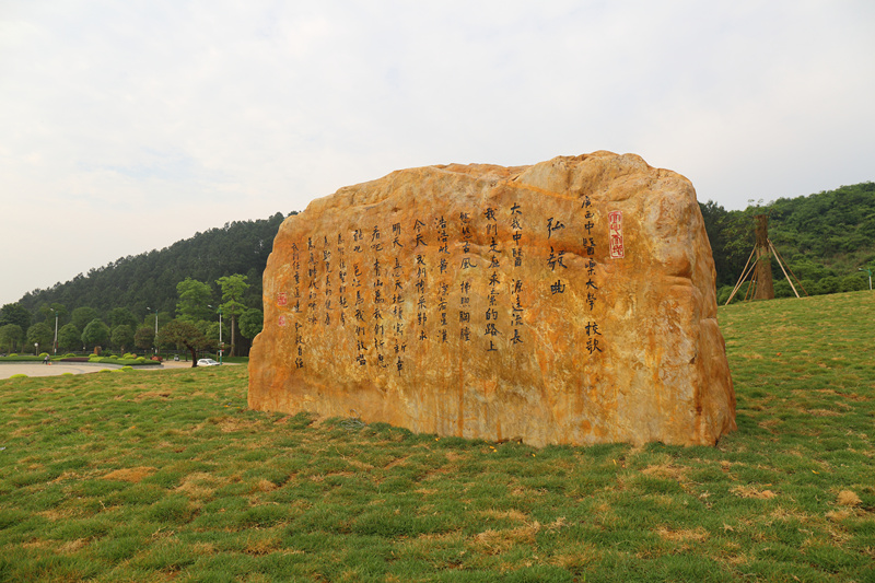 教学管理中心前的大草坪上,阿平湖系列文化景观依次排列,镌刻YABO鸭脖校歌《弘毅曲》的校歌石、篆刻“弘毅自强”“YABO鸭脖”印章的文化石、“滋兰树惠”石紧密相连,位于教学管理中心左侧阿平湖旁的“智者乐水”石,与位于药师山吴萸路口的“仁者乐山”石隔着尊贤路遥相呼应。