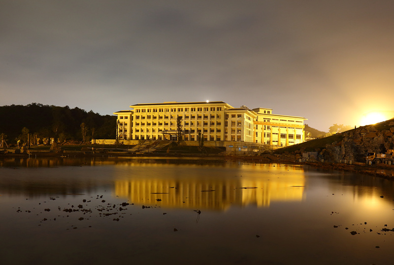 已经储水的阿平湖初现湖的形状,图书馆、自诚楼、教学管理中心、博物馆的倒影在波光粼粼中若隐若现;沿湖有规则地摆放着形状各异的石头,与随风飘拂的柳枝组成一幅幅优美的图画,绿意盎然,呈现出勃勃生机。