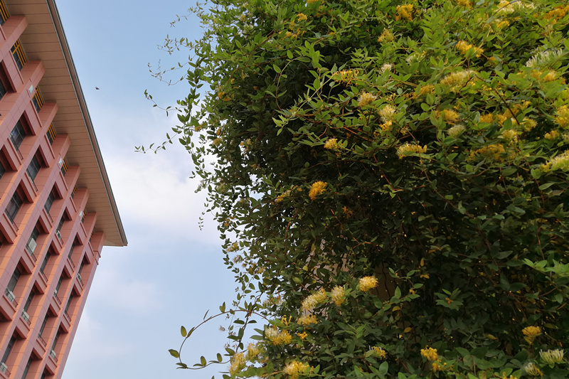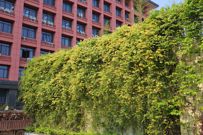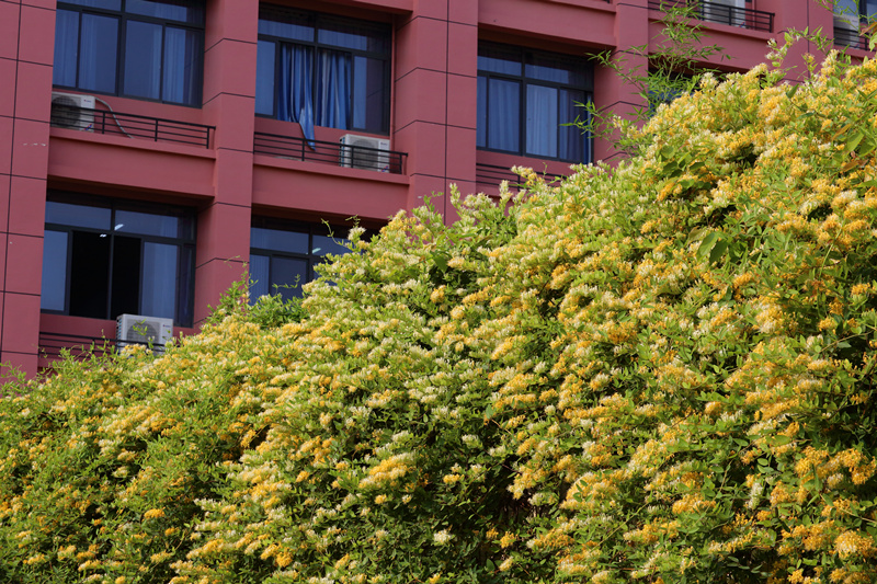 漫步YABO鸭脖仙葫校区,来到位于亲亲路的五味林旁,阵阵浓郁的花香扑鼻而来,只见五味林西侧墙上,集观赏、药用于一身的金银花正争芳斗艳、竞相绽放,正是“金虎胎含素,黄银瑞出云。参差随意染,深浅一香薰。”