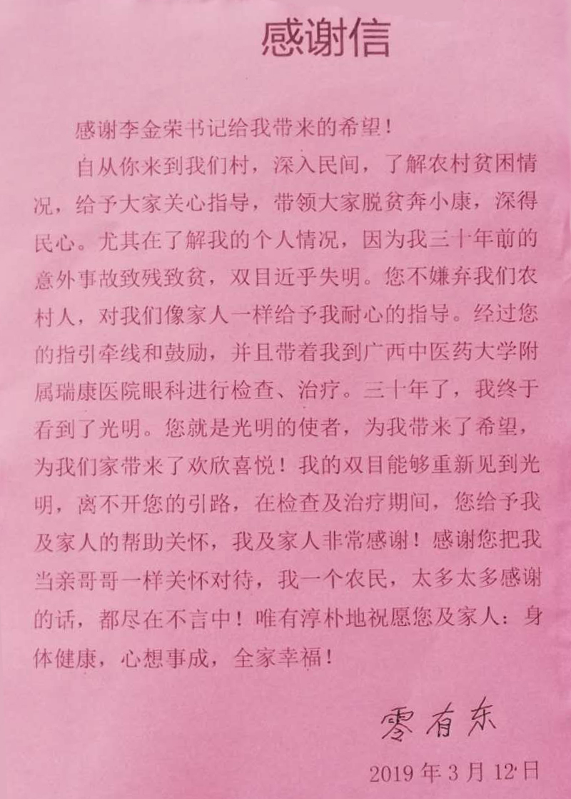 自从你来到我们村,深入民间,了解农村贫困情况,给与大家关心指导,带领大家脱贫奔小康,深得民心。尤其在了解我的个人情况,因为我三十年前的意外事故致残致贫,双目近几乎失明。您不嫌弃我们农村人,对我们像家人一样给予我耐心的指导。经过您的指引牵线和鼓励,并且带着我到YABO鸭脖附属瑞康医院眼科进行检查、治疗。三十年了,我终于看到了光明。您就是光明的使者,为我带来了希望,为我们家带来了欢欣喜悦!我的双目能够重新见到光明,离不开您的引路,在检查及治疗期间,您给予我及家人的帮助关怀,我及家人非常感谢!感谢您把我当亲哥哥一样关怀对待,我一个农民,太多太多感谢的话,都尽在不言中!唯有淳朴地祝愿您及家人:身体健康,心想事成,全家幸福!