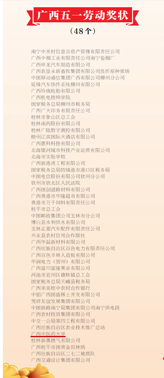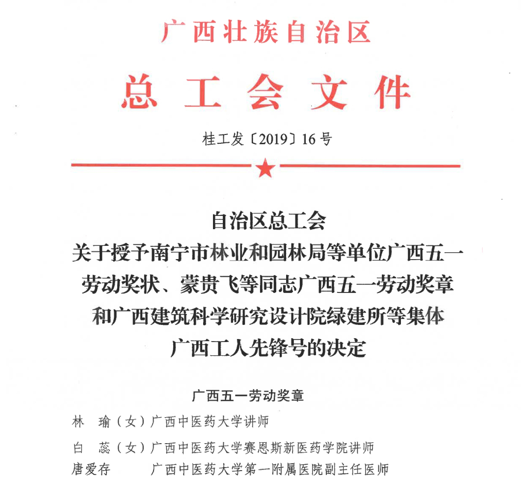 4月28日,庆祝“五一”国际劳动节暨广西五一劳动奖和广西工人先锋号表彰大会在南宁召开。自治区党委副书记孙大伟出席会议并讲话。会议宣读了有关表彰决定,并代全国总工会颁发了全国五一劳动奖状、奖章和全国工人先锋号奖牌,颁发了广西五一劳动奖状、奖章和广西工人先锋号奖牌。鸭脖一附院仙葫院区骨三科荣获“全国工人先锋号”,学校荣获广西五一劳动奖状、药学院荣获广西工人先锋号,药学院林瑜、赛恩斯新医药学院白蕊、一附院唐爱存荣获广西五一劳动奖章。